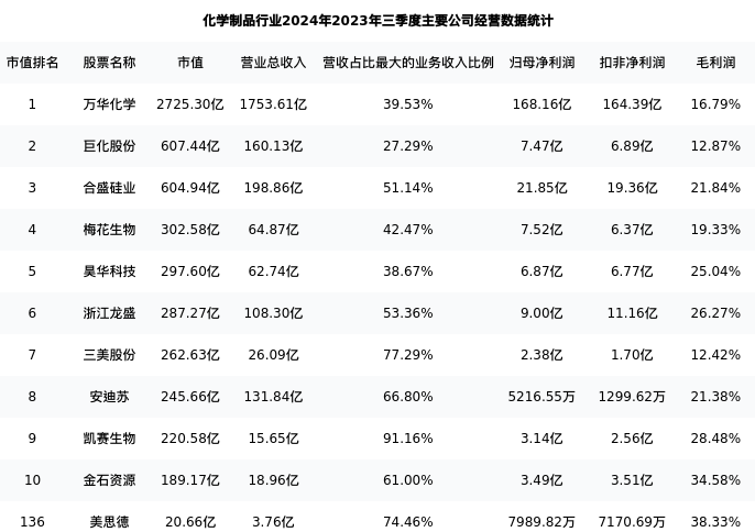 美思德最新报告期数据为2023年三季度,下表汇总了化学制品行业内市值靠前的公司2023年三季度主要经营数据