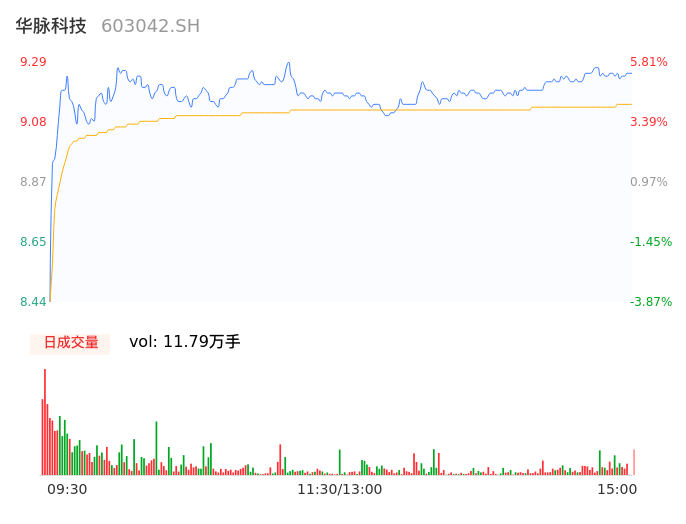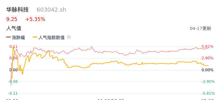 04月17日,华脉科技收报9.25,股价涨幅5.35%,成交金额1.08亿元,换手率7.34%。