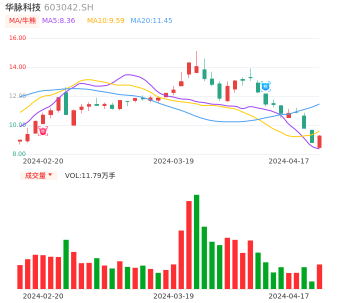 华脉科技在4月8日出现日线级别熊点,从熊点信号发出到今日8日内累积跌幅已经达到19.07%,股价近期跌幅巨大,KD指标数值为:10.93,已经出现超卖信号,短期套牢盘严重,如后期60分钟周期由熊转牛且基本面/消息面未发生重大变化则可能弱势反弹。