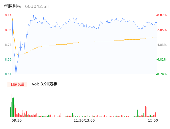 04月22日,华脉科技收报9.03,股价涨幅-2.06%,成交金额7890.90万元,换手率5.54%。