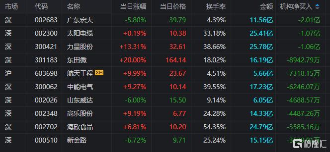 龙虎榜中涉及机构专用席位的个股中,单日净卖出额前三为广东宏大、太阳电缆、力星股份,分别为2.01亿元、1.07亿元、1.06亿元。