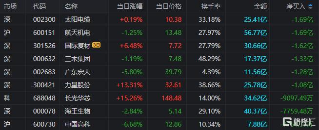 龙虎榜单日净卖出额前三为太阳电缆、航天机电、三木集团,分别为1.69亿元、1.69亿元、1.33亿元。