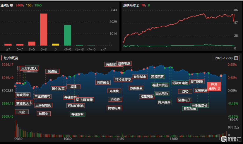 12月8日,沪指涨0.54%,深证成指涨1.39%,创业板指涨2.6%。两市成交额再度突破2万亿元,超3400只个股上涨。算力硬件、能源金属、福建等板块涨幅居前,煤炭、贵金属、油气等板块下跌。