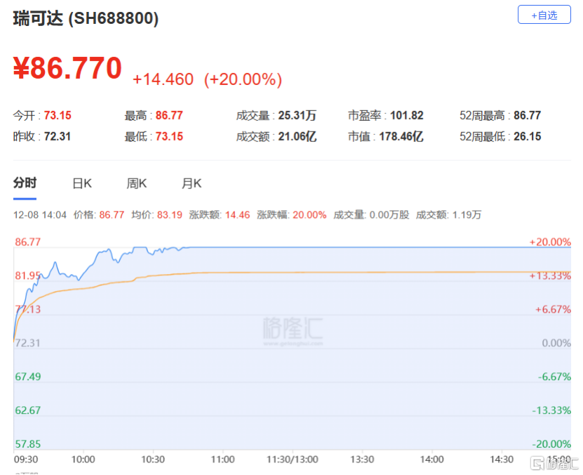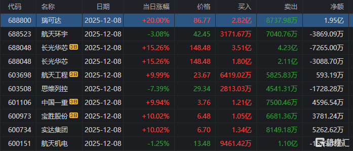 在龙虎榜中,涉及沪股通专用席位的个股有6只,瑞可达的沪股通专用席位净买入额最大,净买入1.95亿元。