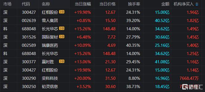 龙虎榜中涉及机构专用席位的个股中,单日净买入额前三为雪人集团、瑞康医药、长光华芯,分别为1.82亿元、1.40亿元、1.25亿元。