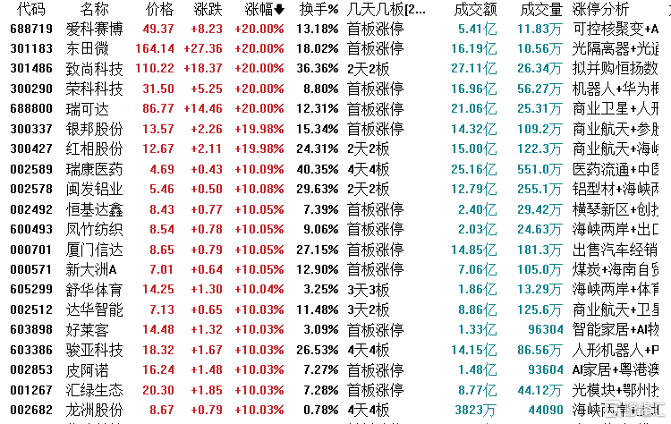 焦点股方面,福建板块延续强势,合富中国30天16板、实达集团13天8板、安记食品5连板,商业航天概念继续活跃,顺灏股份7天6板、通宇通讯8天5板。