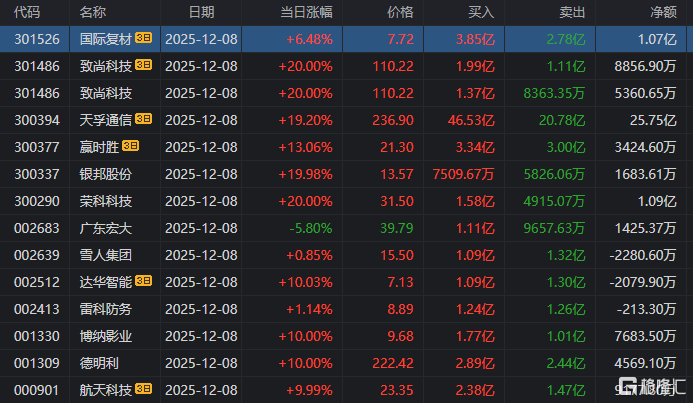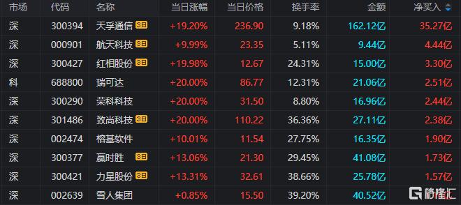 龙虎榜单日净买入额前三为瑞可达、荣科科技、榕基软件,分别为2.51亿元、2.44亿元、1.90亿元。