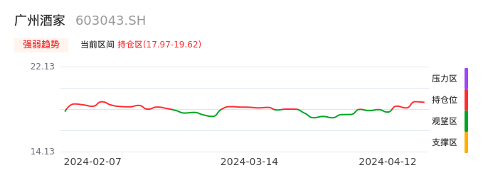我们来看一下该股的九方特色指标强弱趋势的情况:广州酒家自04月09日从观望区上穿到持仓区。股价近期在多头区域持续强势上扬,上升动能仍较为充足,可积极关注。后续重点关注上方压力位:19.62元是否能突破上攻。