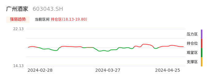 我们来看一下该股的九方特色指标强弱趋势的情况:广州酒家自04月17日从观望区上穿到持仓区。股价近期在多头区域回调整理。后续重点关注多空分界点的争夺:18.13元。如未能有效站稳则可能重新回到空头行情。