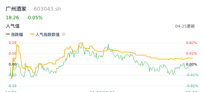 04月25日,广州酒家收报18.26,股价涨幅-0.05%,成交金额5382.64万元,换手率0.52%。