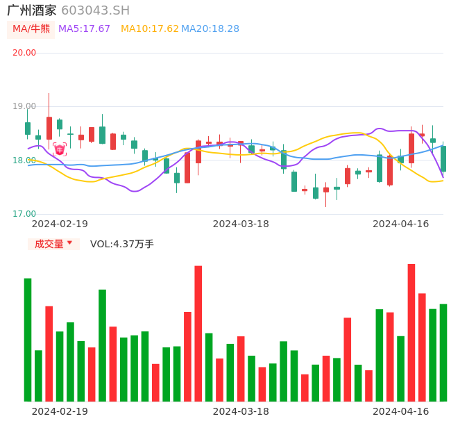 04月16日,广州酒家收报17.79,股价涨幅-2.95%,成交金额7852.45万元,换手率0.77%。