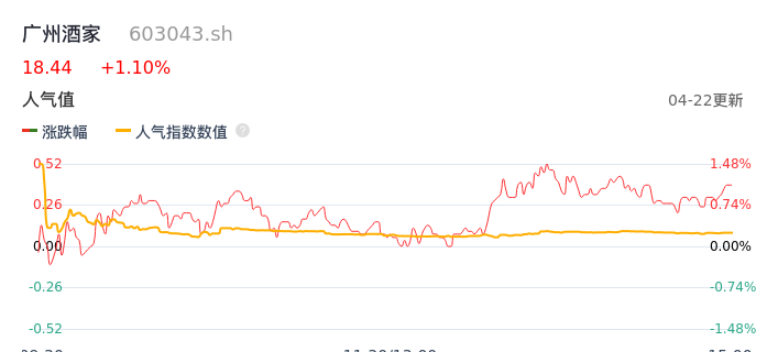 04月22日,广州酒家收报18.44,股价涨幅1.10%,成交金额8250.41万元,换手率0.79%。