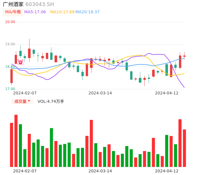 04月12日,广州酒家收报18.49,股价涨幅0.00%,成交金额8775.15万元,换手率0.83%。