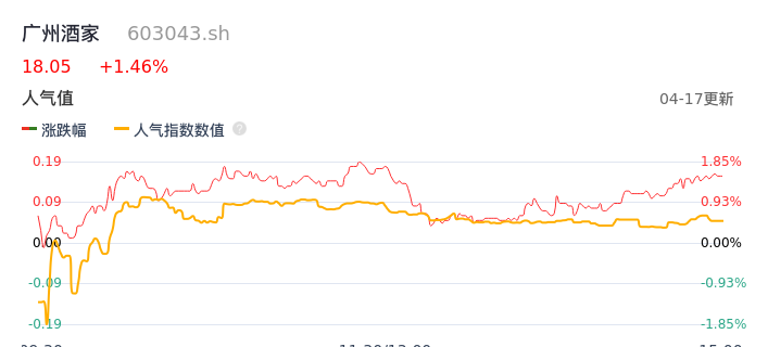 04月17日,广州酒家收报18.05,股价涨幅1.46%,成交金额5744.07万元,换手率0.56%。
