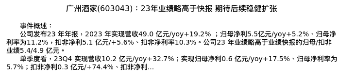 值得注意的是:2024年04月天风证券的何富丽/陈潇分析师,首次发布关于广州酒家的研究报告,标题为:广州酒家(603043):23年业绩略高于快报 期待后续稳健扩张。