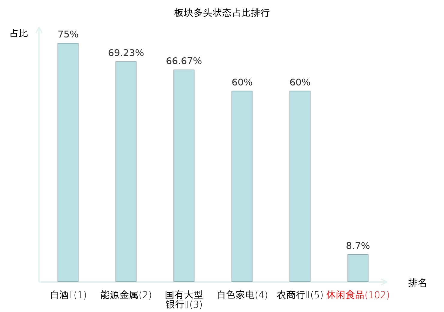 全市场所有行业板块中主力多头状态占比排名中,白酒Ⅱ板块位居第一。房地产服务板块名次提升最快,较昨日上升86位。