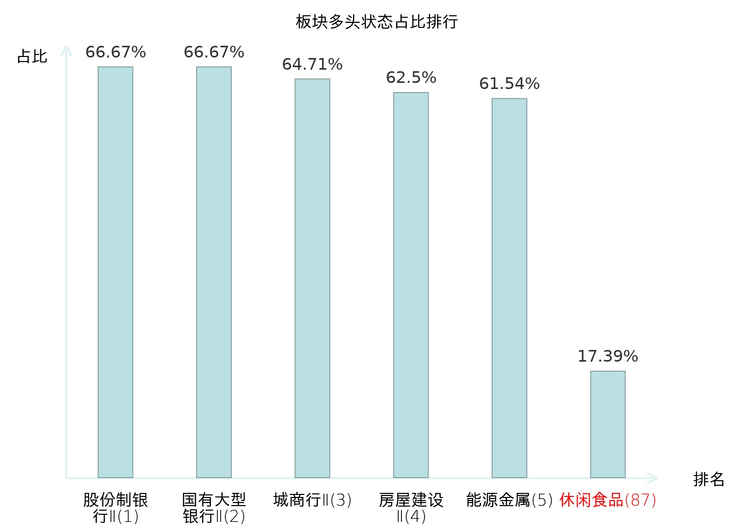 全市场所有行业板块中主力多头状态占比排名中,股份制银行Ⅱ板块位居第一。其他家电Ⅱ板块名次提升最快,较昨日上升102位。