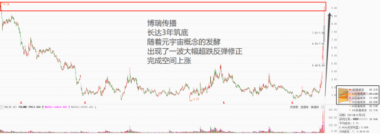 经过长周期的下跌之后,博瑞传播在2018年直到2021年12月一直在底部进行箱体震荡,从筹码分布来看筹码在底部形成单峰密集,随后公司成为数字文化产权交易平台+元宇宙+哔哩哔哩概念股,叠加了多重利好的共同催化,股价成功完成了一波大幅超跌反弹修正。