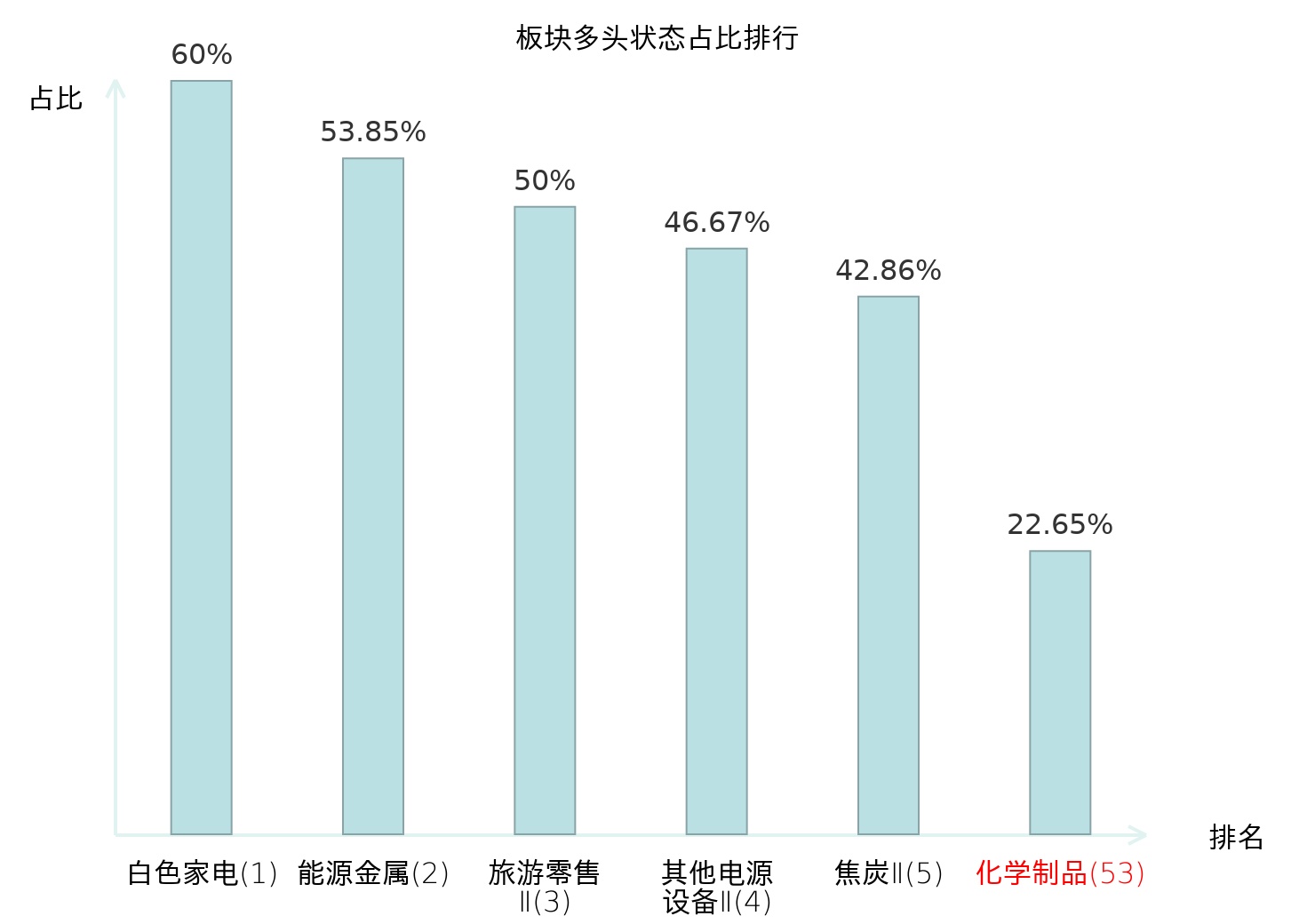 全市场所有行业板块中主力多头状态占比排名中,白色家电板块位居第一。油服工程板块名次提升最快,较昨日上升87位。
