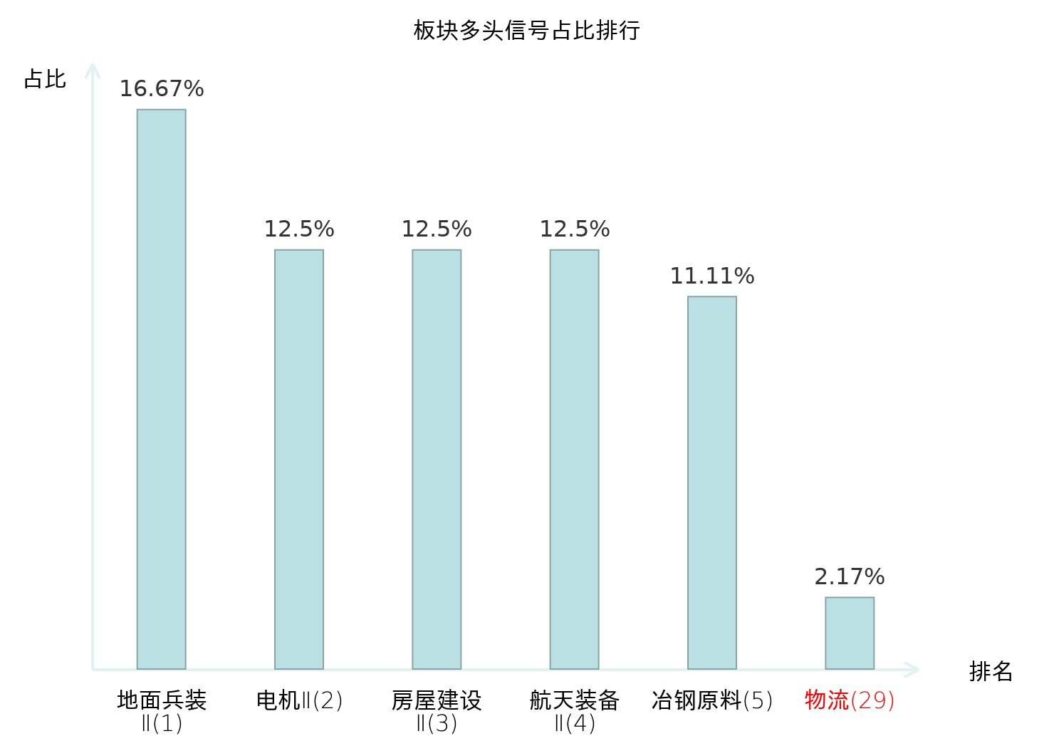 全市场所有行业板块中主力多头信号占比排名中,地面兵装Ⅱ板块位居第一。房屋建设Ⅱ板块名次提升最快,较昨日上升115位。