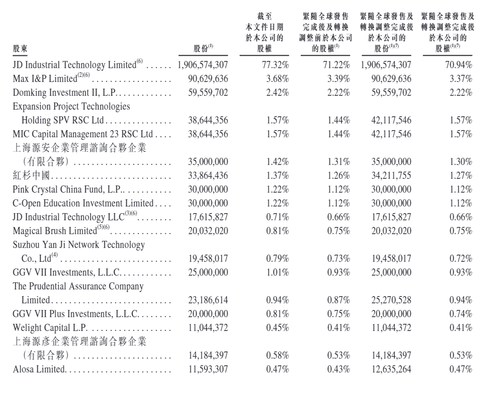 紧随全球发售及转换调整完成后(假设超额配股权未获行使且不计根据股权激励计划将予发行的股份),京东工业的控股股东将合计控制其已发行股本总额的约75.71%。
