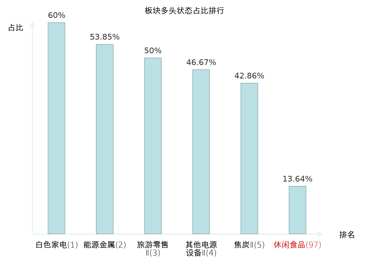 全市场所有行业板块中主力多头状态占比排名中,白色家电板块位居第一。油服工程板块名次提升最快,较昨日上升87位。