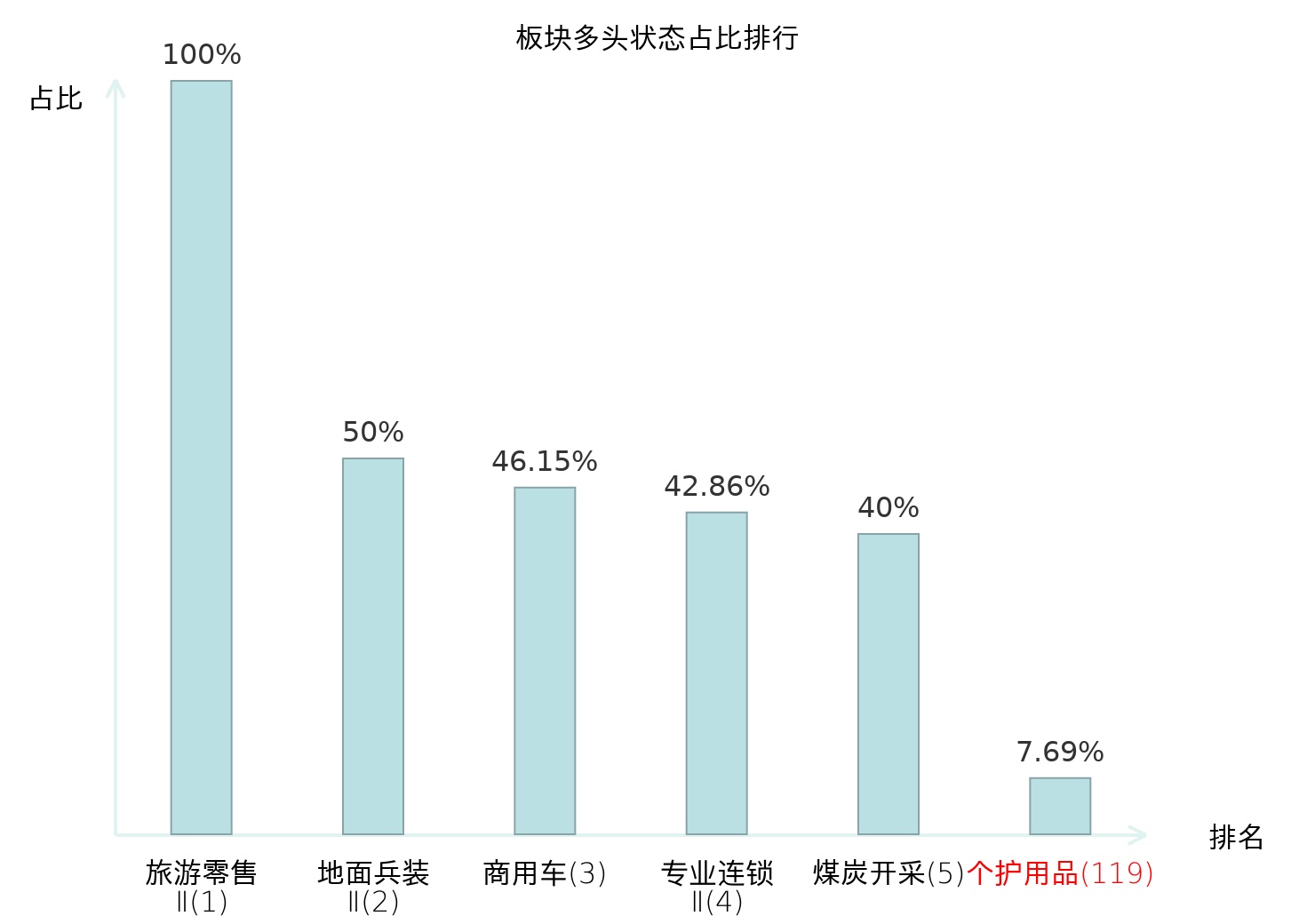 全市场所有行业板块中主力多头状态占比排名中,旅游零售Ⅱ板块位居第一。汽车服务板块名次提升最快,较昨日上升83位。
