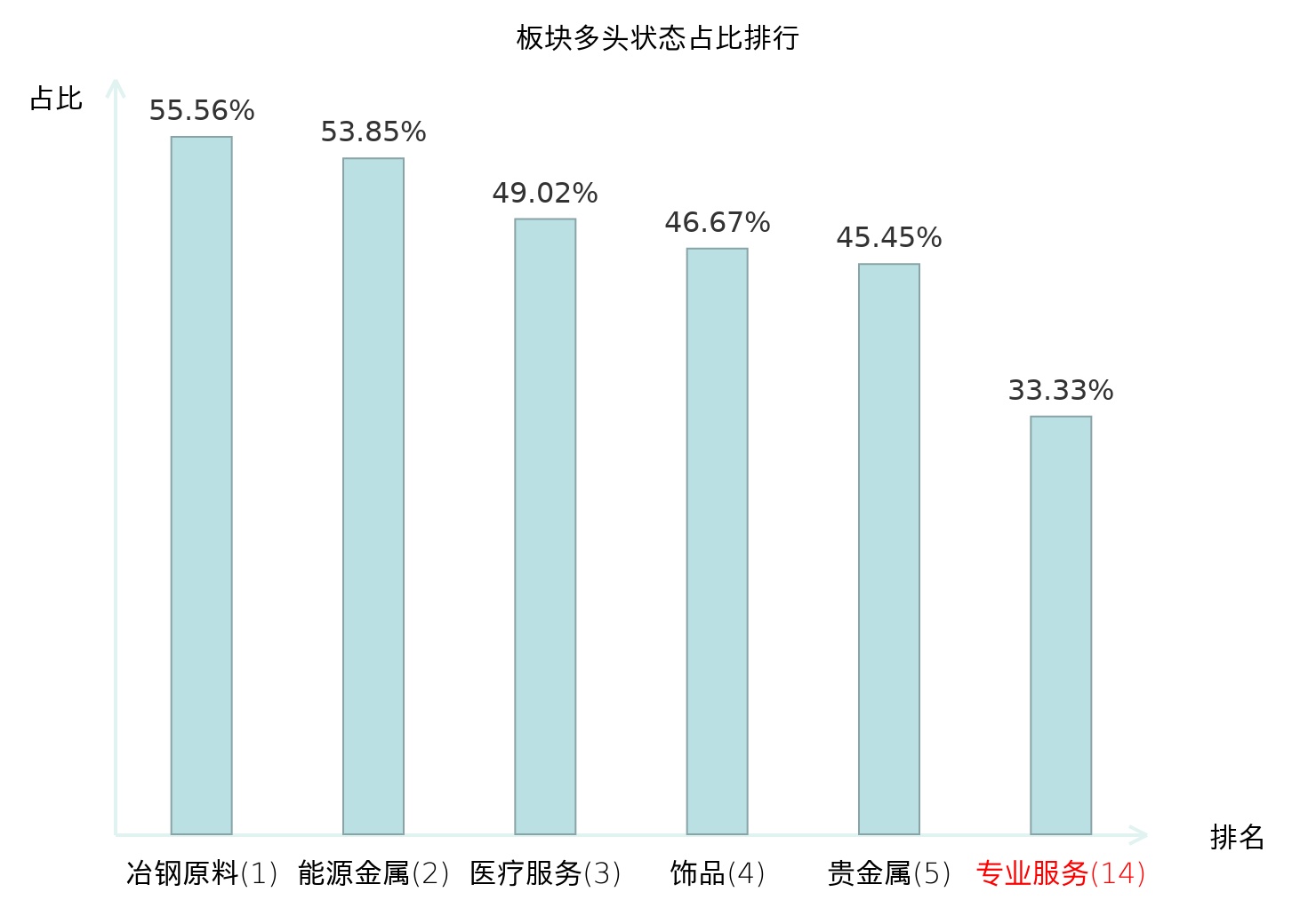 全市场所有行业板块中主力多头状态占比排名中,冶钢原料板块位居第一。能源金属板块名次提升最快,较昨日上升89位。