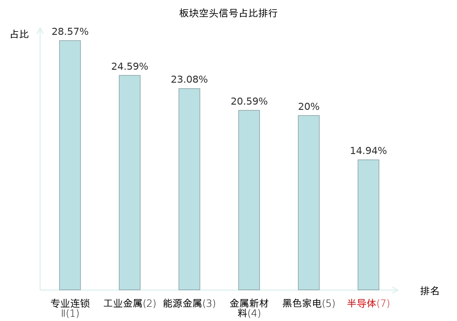 从主力宝信号数据分析,金海通所属的半导体板块中共26只股票发出主力空头信号,主力空头信号占比在全行业中排名第7位,较昨日上升30位;较高的排名表明主力对于该板块整体卖出意愿较强,此次排名显著上升可能反映了主力对该板块态度的强化调整;全市场所有行业板块中主力空头信号占比排名中,专业连锁Ⅱ板块位居第一;装修建材板块名次提升最快,较昨日上升120位;这些变动揭示了不同行业间主力资金行为的分化趋势,为投资者评估市场压力分布与潜在风险节点提供了客观依据。