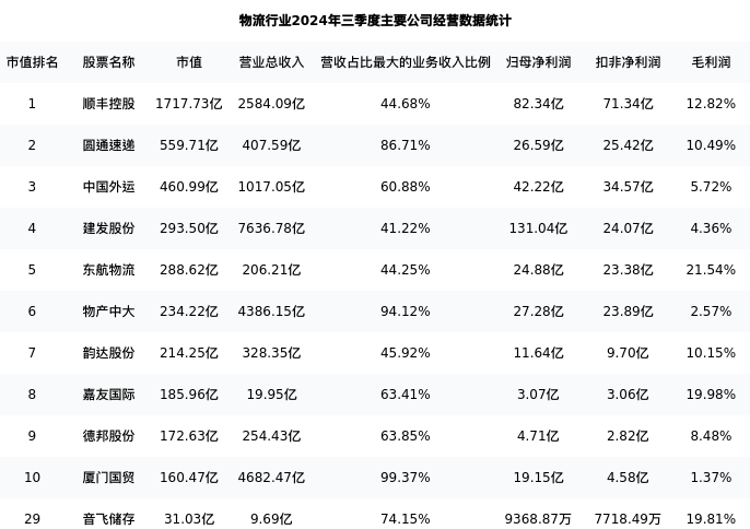 音飞储存最新报告期数据为三季度,下表汇总了物流行业内市值靠前的公司三季度主要经营数据