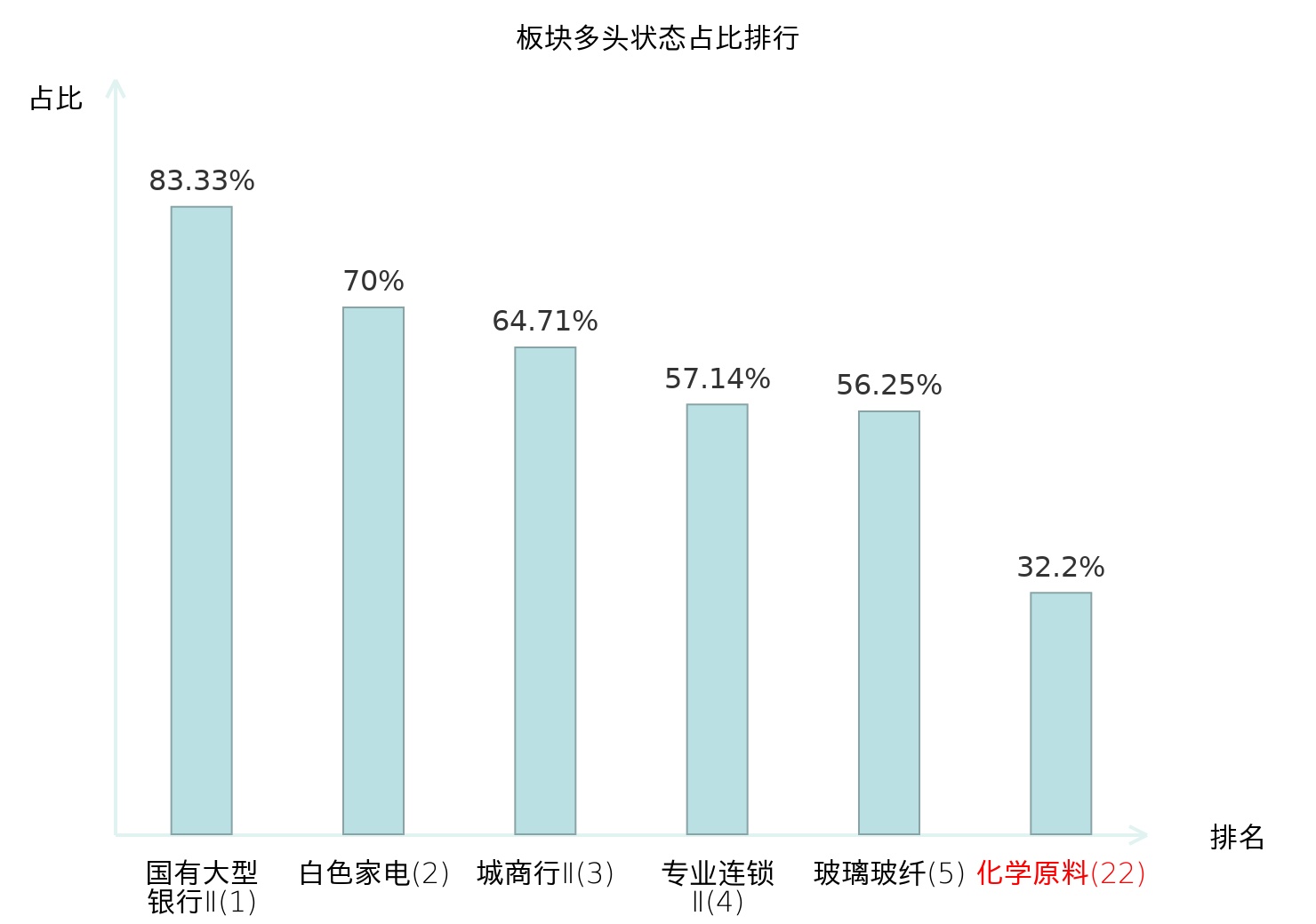 全市场所有行业板块中主力多头状态占比排名中,国有大型银行Ⅱ板块位居第一。食品加工板块名次提升最快,较昨日上升51位。