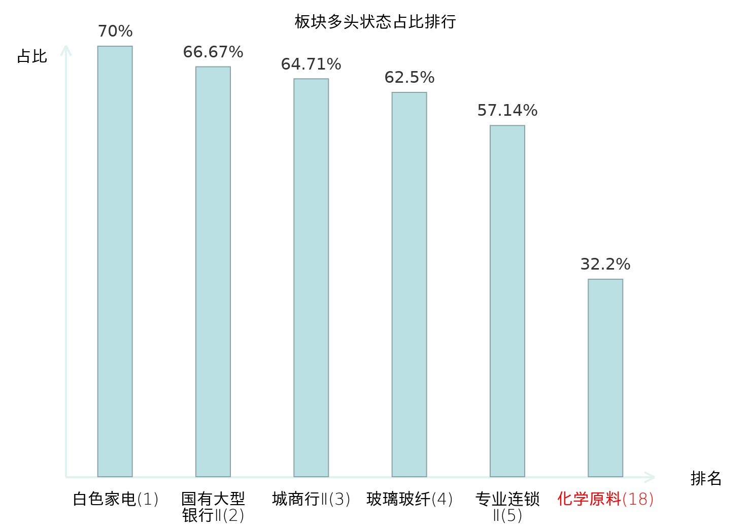全市场所有行业板块中主力多头状态占比排名中,白色家电板块位居第一。油气开采Ⅱ板块名次提升最快,较昨日上升96位。