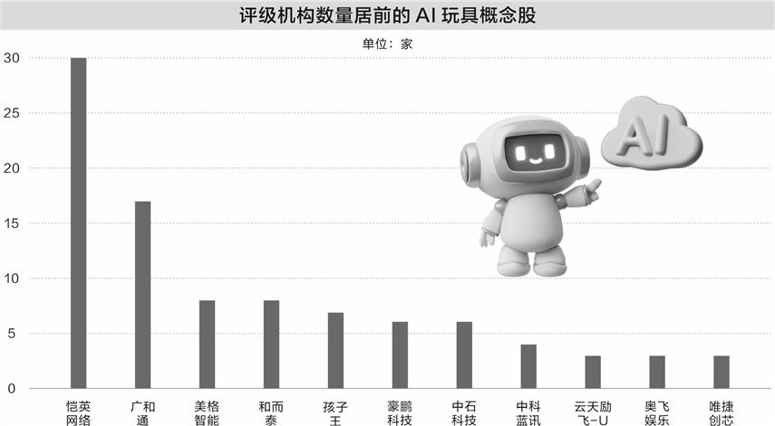 机构关注度方面,机构给予“积极型”评级(含买入、增持、强烈推荐等)的AI玩具概念股有18只。恺英网络、广和通、美格智能、和而泰、孩子王等获评级机构数量靠前。