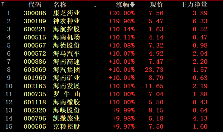 7月24日,海南自贸板块全线暴涨,板块指数大涨超9%,康芝药业、神农种业、海航控股等21股涨停