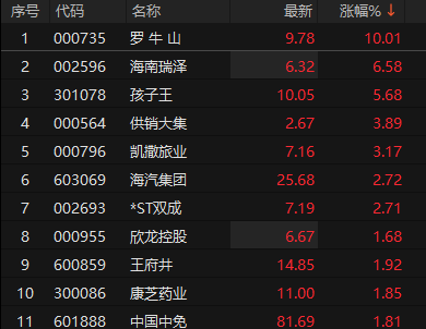 上证报中国证券网讯 12月10日早盘,海南自贸概念震荡反弹,截至9时38分,罗牛山涨停,海南瑞泽涨超6%,孩子王涨逾5%,供销大集、凯撒旅业、海汽集团等跟涨。