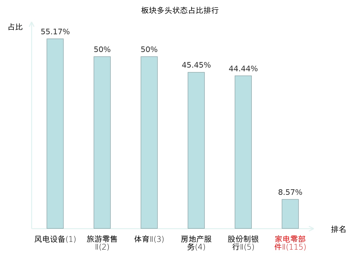全市场所有行业板块中主力多头状态占比排名中,风电设备板块位居第一。保险Ⅱ板块名次提升最快,较昨日上升64位。