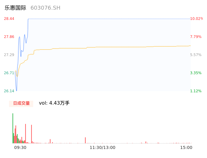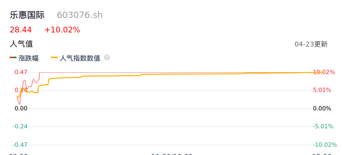 04月23日,乐惠国际收报28.44,股价涨幅10.02%,成交金额1.22亿元,换手率3.67%。