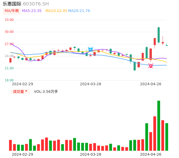 04月26日,乐惠国际收报26.59,股价涨幅-3.13%,成交金额9520.21万元,换手率2.95%。