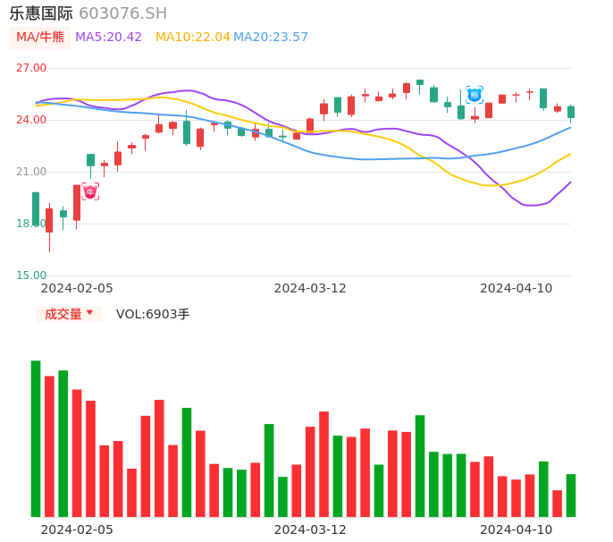 04月10日,乐惠国际收报24.13,股价涨幅-2.58%,成交金额1672.57万元,换手率0.57%。