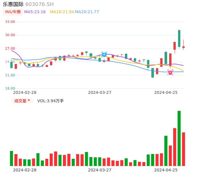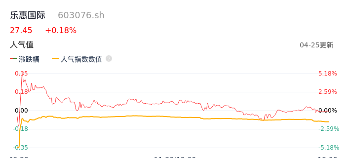 04月25日,乐惠国际收报27.45,股价涨幅0.18%,成交金额1.10亿元,换手率3.26%。