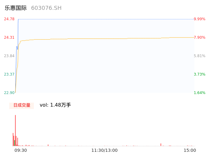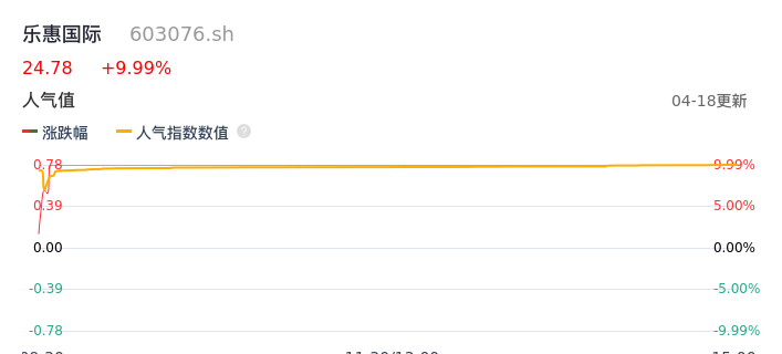 04月18日,乐惠国际收报24.78,股价涨幅9.99%,成交金额3613.89万元,换手率1.23%。