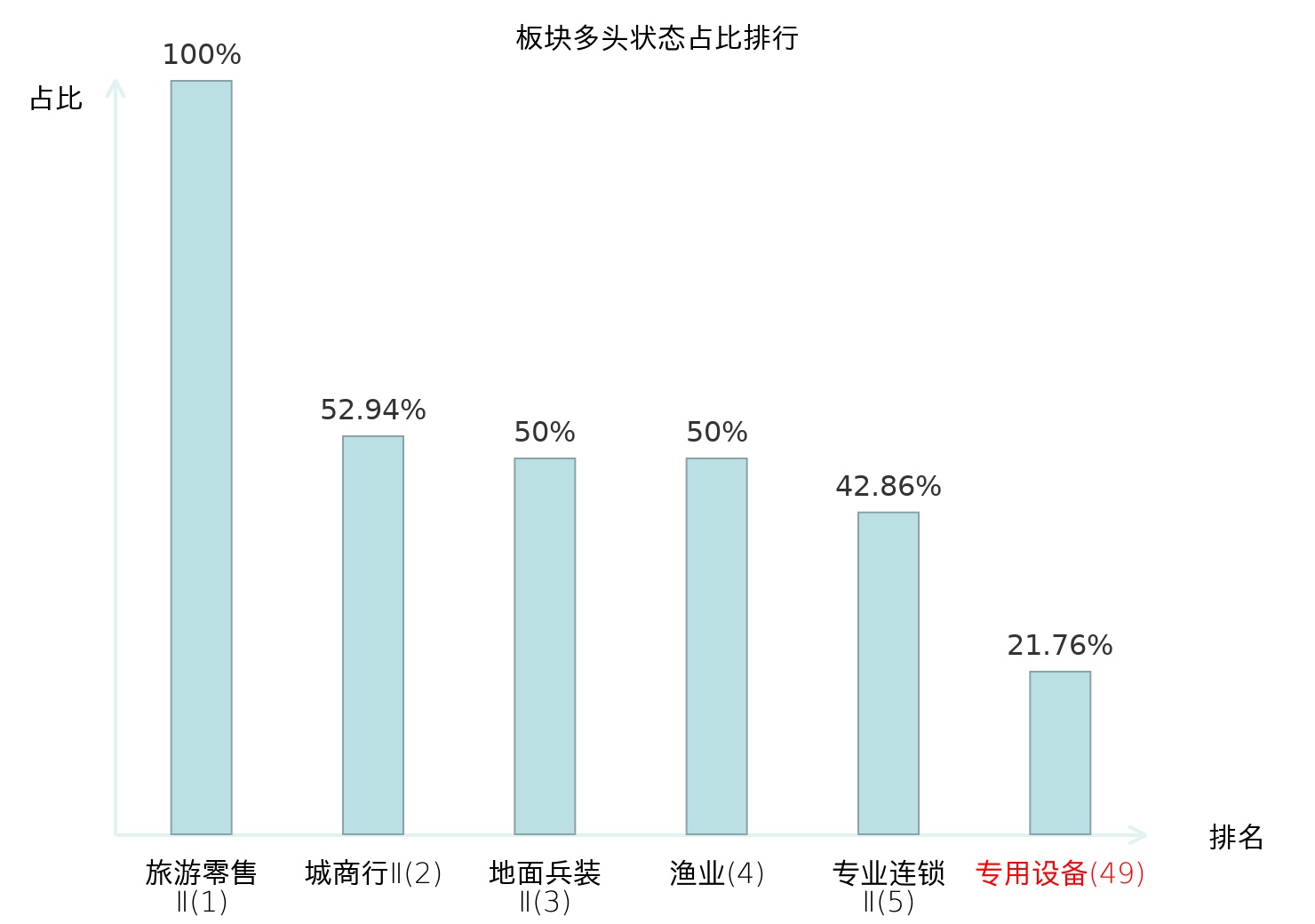 全市场所有行业板块中主力多头状态占比排名中,旅游零售Ⅱ板块位居第一。旅游及景区板块名次提升最快,较昨日上升69位。