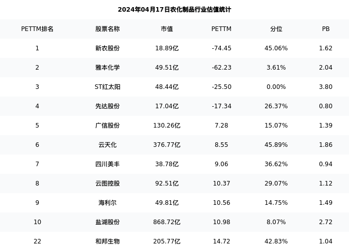 从估值角度看:和邦生物最新市盈率PETTM为14.72,在行业内排名18/57,处于42.83分位。