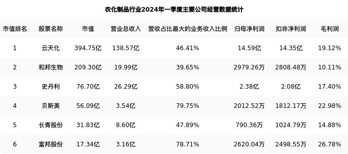 和邦生物最新报告期数据为一季度,下表汇总了农化制品行业内市值靠前的公司一季度主要经营数据
