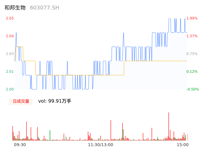 04月26日,和邦生物收报2.05,股价涨幅1.99%,成交金额2.02亿元,换手率1.13%。