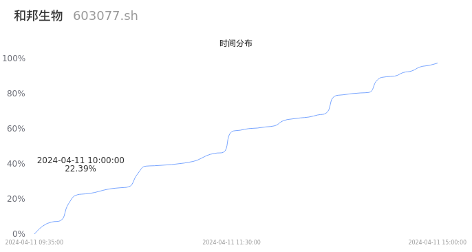 603077和邦生物2024年04月11日成交65.02万手,成交金额1.54亿元,相较昨日放量16.64万手,换手率0.74%,成交清淡。
