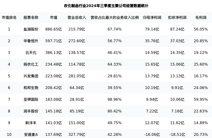 和邦生物最新报告期数据为三季度,下表汇总了农化制品行业内市值靠前的公司三季度主要经营数据