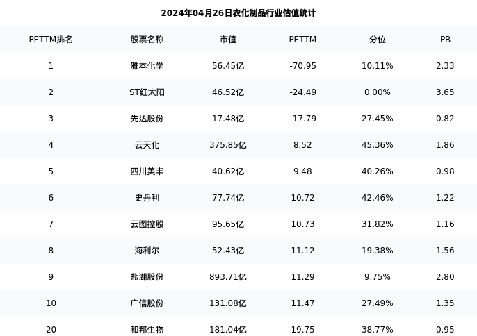 从估值角度看:和邦生物最新市盈率PETTM为19.75,在行业内排名18/57,处于38.77分位。