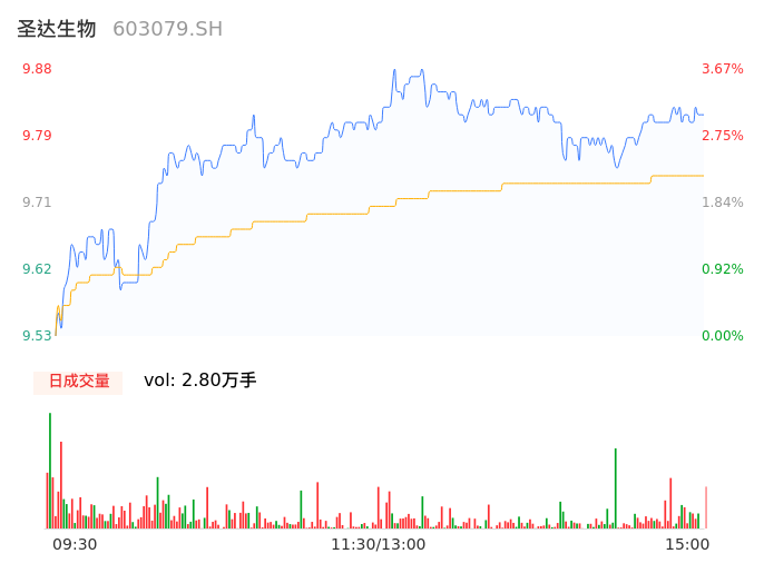 04月24日,圣达生物收报9.83,股价涨幅3.15%,成交金额2727.88万元,换手率1.64%。