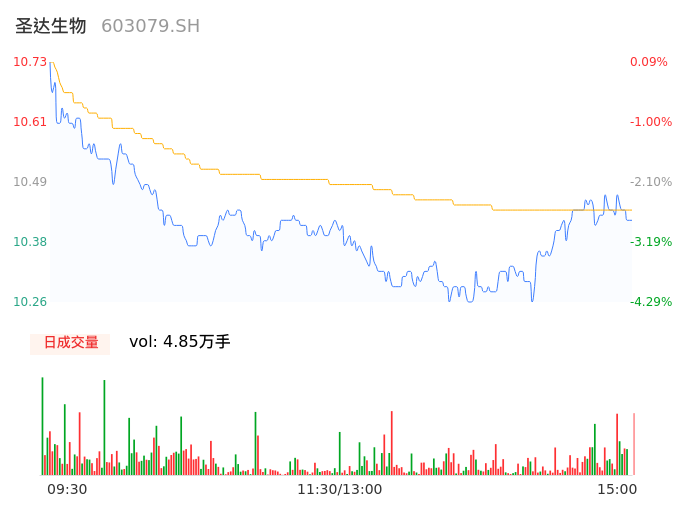 04月10日,圣达生物收报10.42,股价涨幅-2.80%,成交金额5056.69万元,换手率2.83%。